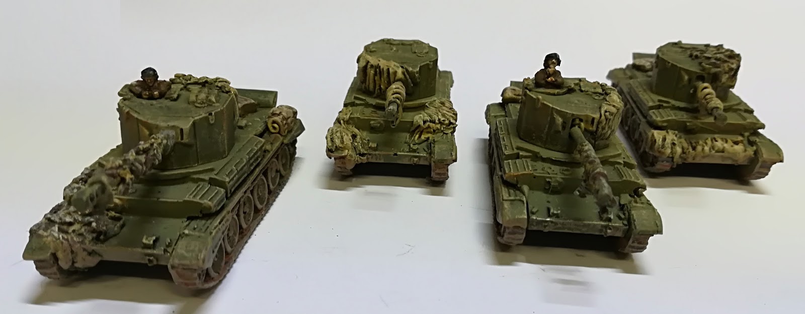 After a year of working on them (or not working) I am finally putting the finishing touches to them, I am still doing finishing touches, the Unit markings etc.. but here is a selection. I can field 3 troops of three Cromwell's with a Challenger to support each troop and two Command Cromwells.